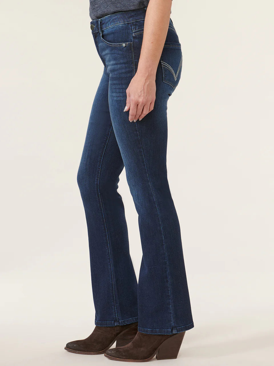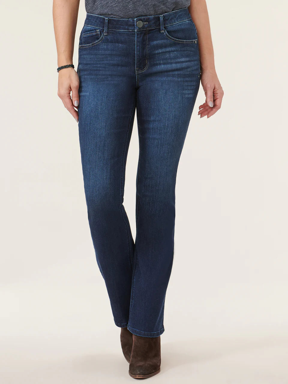 Time for a reboot. Our ultra-flattering, timeless “Ab"solution® high-rise Itty Bitty Boot jean never fails to elevate your everyday style. Interior slimming power mesh panels provide tummy control, a hidden elastic waistband keeps the dreaded gap at bay, super stretchy denim keeps you comfortable, and a slightly arched back yoke with embroidered back pockets add an element of style.