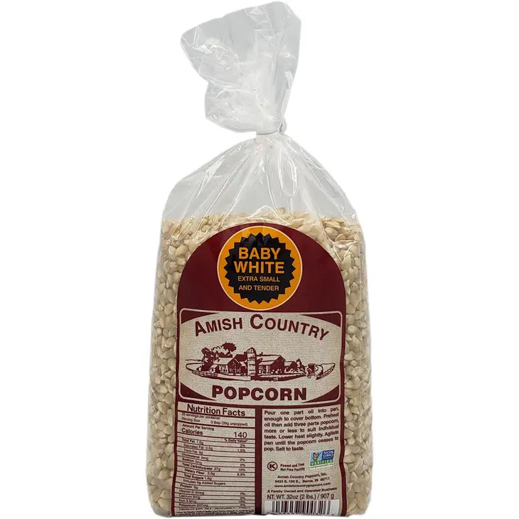 2 pound bags of baby white popcorn - Our most tender variety of popcorn yet! Baby White popcorn is a top-seller, and for good reason! Not only is it small and tender, but it’s hulless as well! See what all the hype is about and try a bag today!