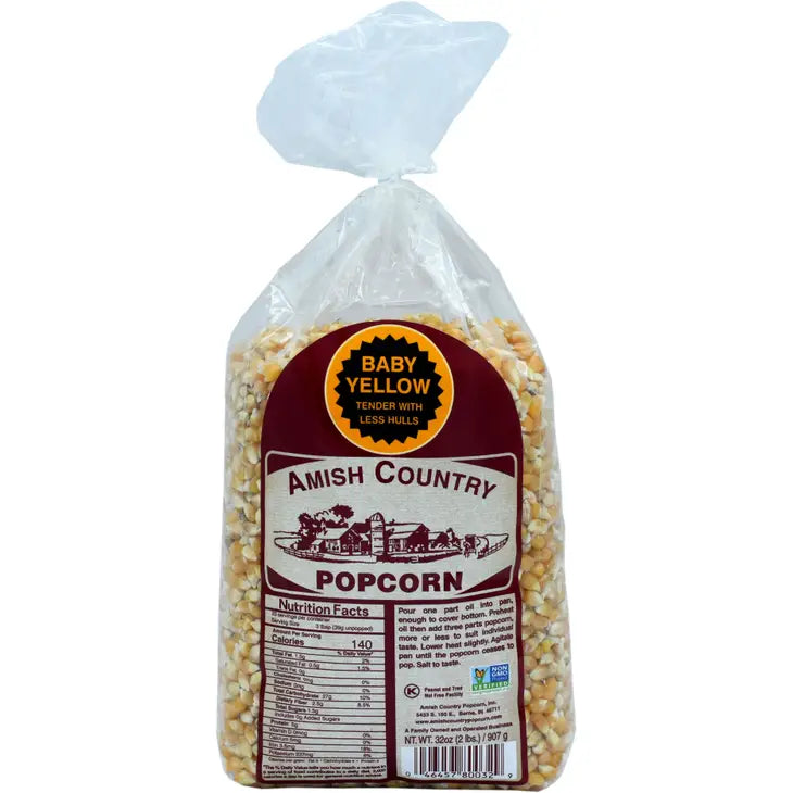 2 pound bag of baby yellow popcorn - This variety is very similar to theater-style popcorn, but just a little smaller and more tender. Don’t like all the hulls, well you’re in luck! Baby Yellow has fewer hulls than most other varieties. Try some today!
