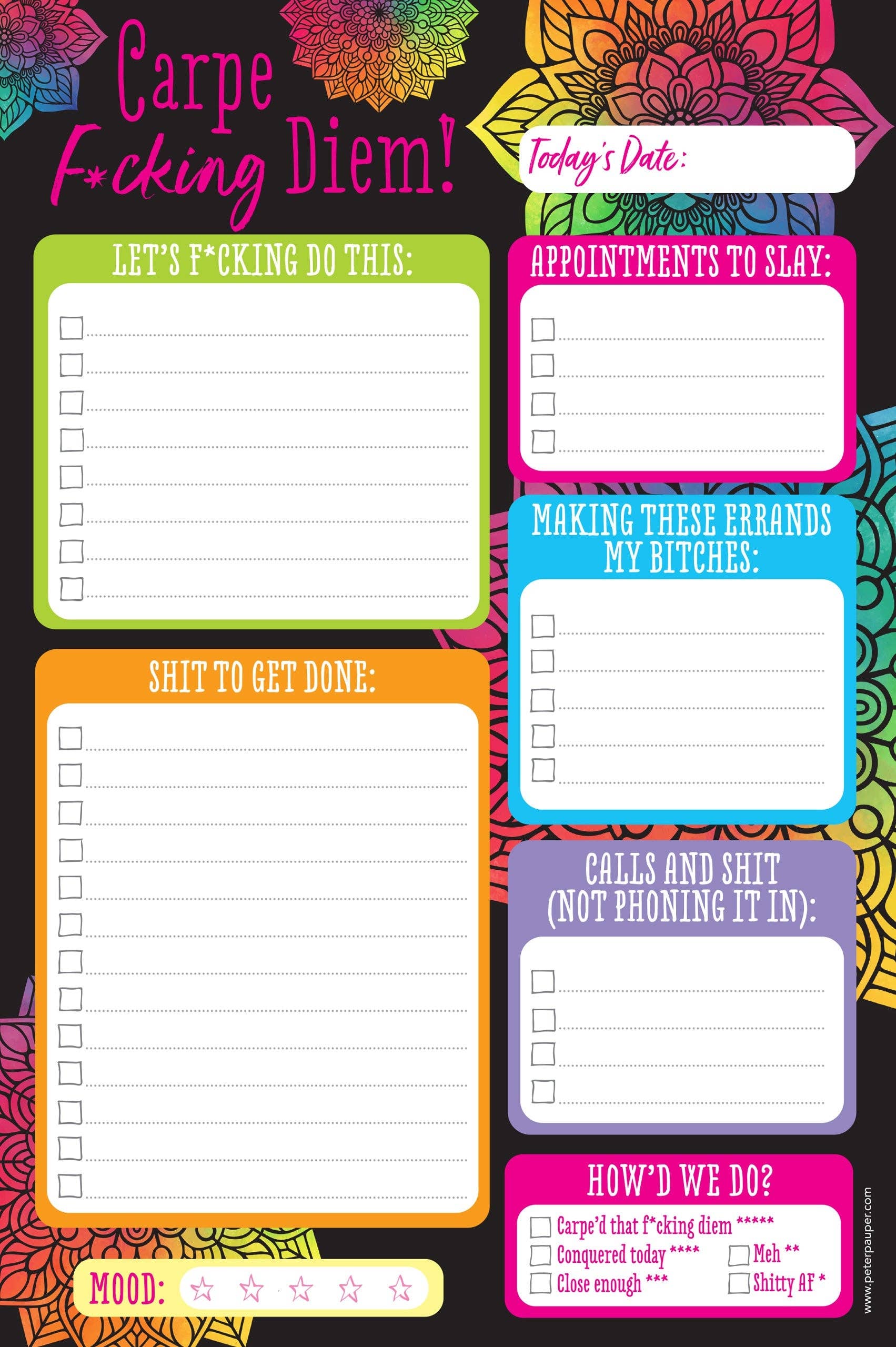 Seize the day with this take-charge, go-getting, get-it-done note pad! Categories include ''Let's F*cking Do This,'' ''Sh*t to Get Done,'' ''Appointments to Slay,'' ''Making These Errands My Bitches,'' ''Calls and Sh*t (Not Phoning It In),'' ''How'd We Do?'' and ''Mood.'' Jot down tasks, errands, appointments, notes, and more. Tearable sheets allow you to take your plans on the go. Check things off as you get them done!