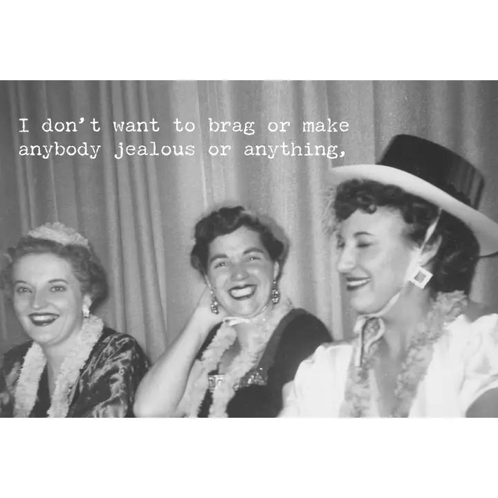 Funny greeting card with vintage photo of three ladies on the front. Outside: I don't want to brag or make anybody jealous or anything, Inside: but I can still fit into the earrings I wore in high school!