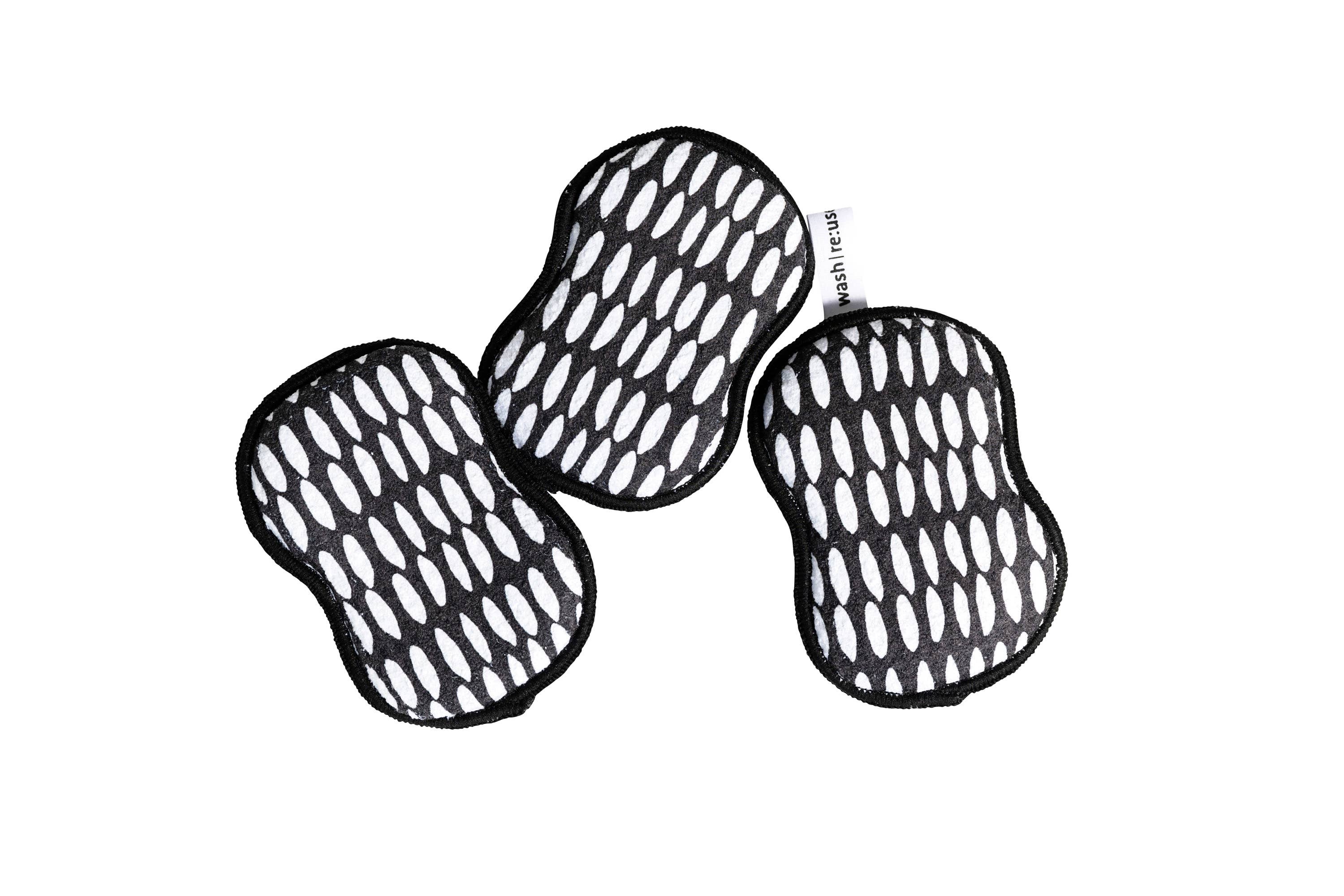 Whistle while you work. Our pretty sponges may feel too pretty to be tough but they are. One side with our good habit waffle fabric, charcoal infused foam center and non-scratch but effective back. Machine Wash and air dry to keep fresh. Our sponges will last longer than your typical cellulose sponge. Find joy in your everyday tasks.