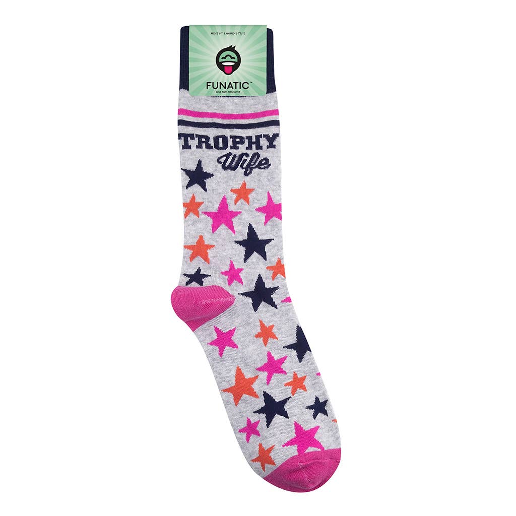 Celebrate your status with our "Trophy Wife" funny wedding socks! Whether you're a proud partner or just appreciate a good laugh, these socks are sure to bring a smile to your face. Crafted with care from high-quality materials, these socks offer both comfort and humor. Whether you're managing a busy household or just enjoying some downtime, these funny socks are the perfect accessory. Get yours today and let your socks be your statement piece!